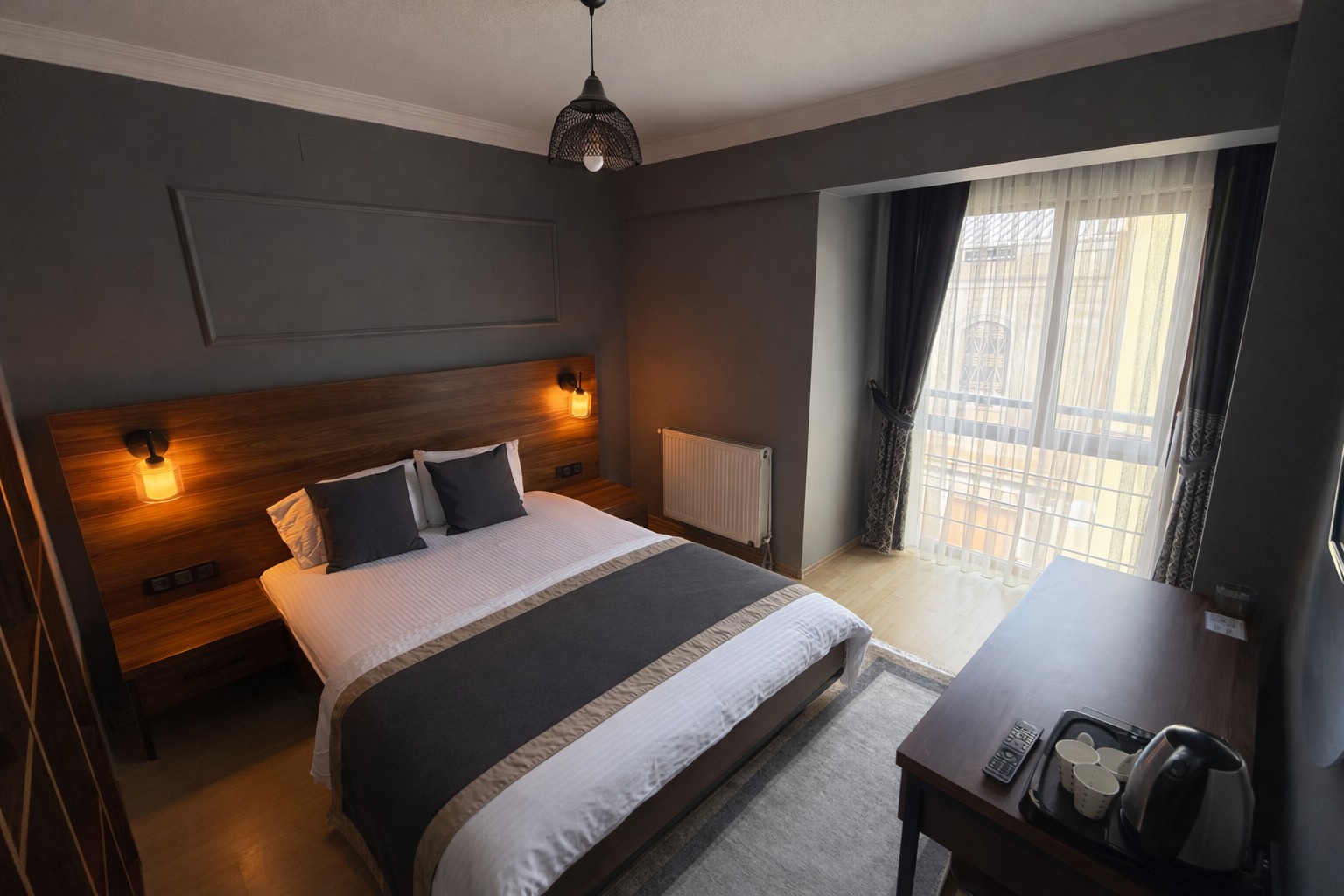 Germiyan Otel’in Tek Kişilik Double Yataklı Odası, tek başına konaklayan misafirler için mükemmel bir konfor sunar. Modern tasarımı ve zarif dekorasyonuyla öne çıkan bu oda, geniş ve rahat bir double yatakla donatılmıştır. Yatak odası, dinlenme ve rahatlama için ideal bir ortam sağlar. Odanın iç mekanında yüksek kaliteli tekstil ürünleri kullanılarak sıcak ve davetkar bir atmosfer yaratılmıştır.