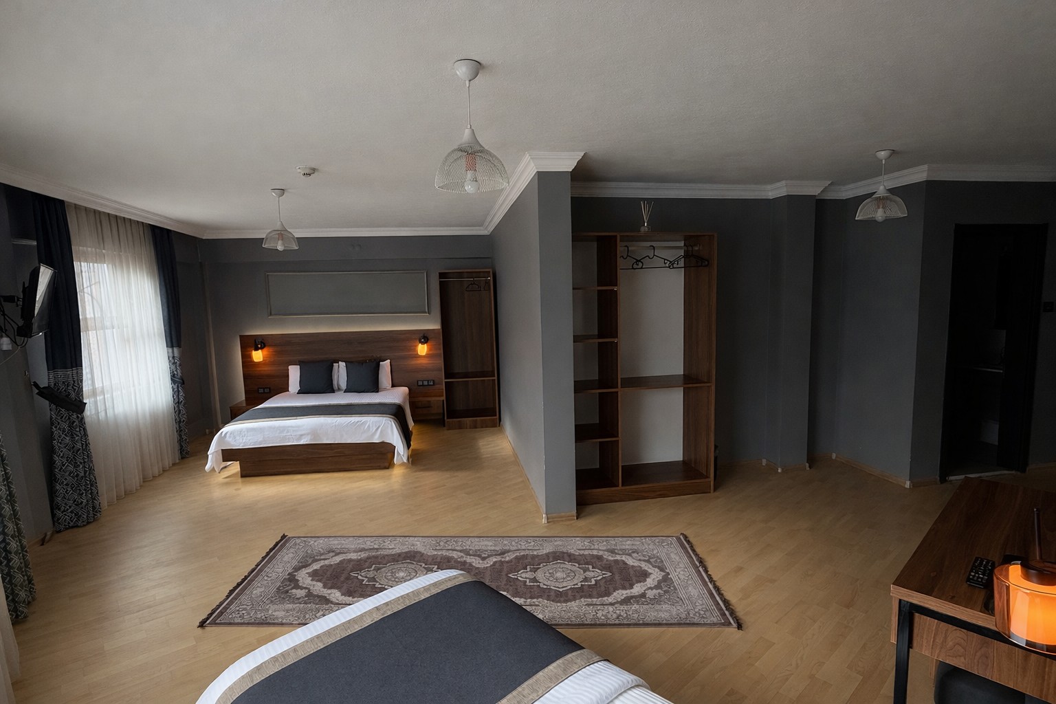Oda geniş ve ferah olup, konukların rahat bir şekilde hareket edebilmesi için yeterli alan sağlar. Her yatak, kaliteli nevresimlerle düzenlenmiş olup, konforlu bir uyku deneyimi sunar.