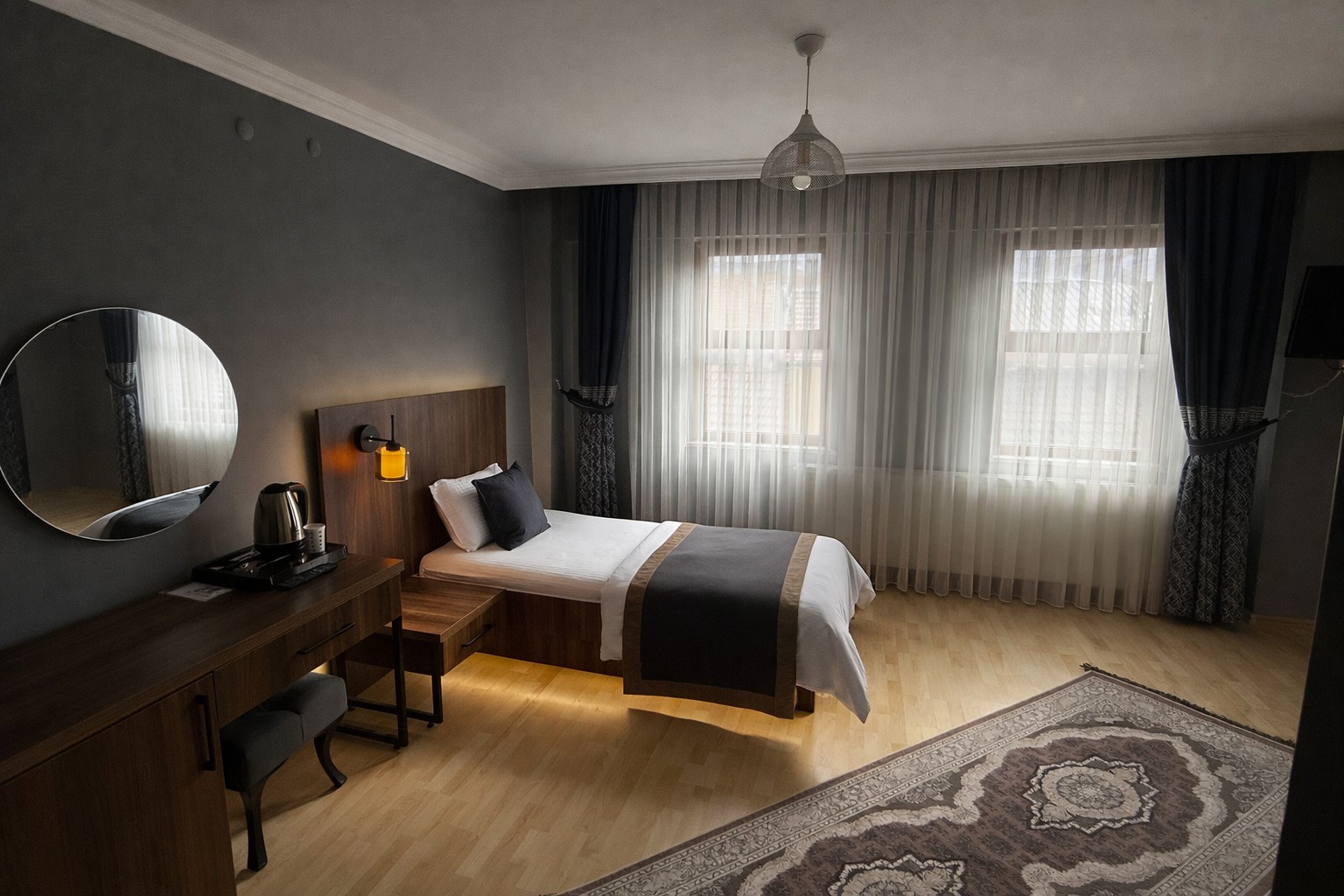 Germiyan Otel’in Üç Kişilik Single Odası, grup halinde seyahat edenler veya küçük aileler için ideal bir konfor sunar. Modern ve şık bir tasarıma sahip olan bu oda, bir adet çift kişilik yatak ve bir adet tek kişilik yatakla donatılmıştır, böylece tüm konuklar rahatça uyuyabilir.