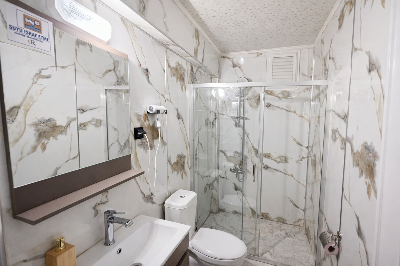 Özel banyoda modern seramikler ve kaliteli banyo malzemeleri kullanılmıştır. Havlular ve banyo terlikleri, her gün taze olarak sağlanır ve hijyen standartlarına büyük özen gösterilir.